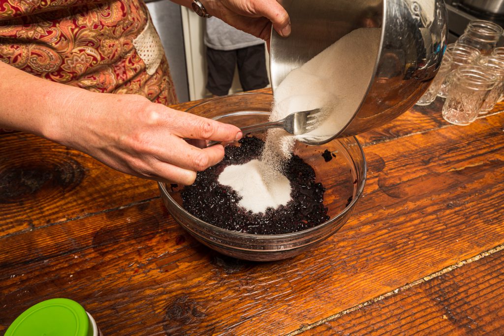 This recipe works with almost all other berries and fills two 8-ounce half-pint jars. Peaches have their own, unique recipe. Be sure and multiply the recipe to utilize all of your berries and fill the necessary number of jars.
