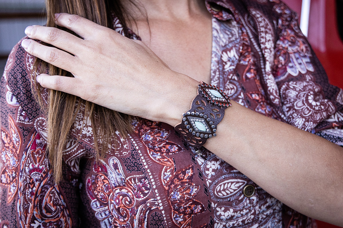 Bracelet from XXXX set against the western pattern of the Nostalgia shirt.